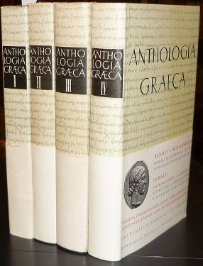 Bild Anthologia graeca. 2. verbesserte Auflage. Griechisch-deutsch ed. Hermann Beckby. 4 Bände (vollständig). München, Heimeran, (1957-1958) [1965-1968]. 8vo. Mit je 1 Titelvign. 703; 622; 854; 772 S., 1 Bl. Schwarze OLwd. m. Rückentitel u. Orig.-Schutzumschlag u. Bauchbinde. <Nr. 32050>