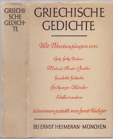Bild Griechische Gedichte. Mit Übertragungen deutscher Dichter hrsg. v. Horst Rüdiger. (5.-6. Tsd.). München, Heimeran, (1939). 8vo. Mit 1 Titelvignette. 367 S. Weiße OLwd. m. Deckel- u. Rückenschild sowie Orig.-Schutzumschlag. Grauer Kopfschnitt. <Nr. 32061>