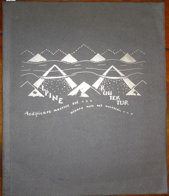 Taut, Bruno. Alpine Architektur. In 5 Teilen und 30 Zeichnungen. Hagen i.W., Folkwang-Verlag, 1919. Folio (40 x 34 cm). Mit gez. Titel u. mont. Inhaltsverz. u. Zwischentiteln sowie 30 meist mont. Taf., davon 8 farbig und einige gold- bzw. silbergehöhte Zeichnungen. <Nr. 29776>